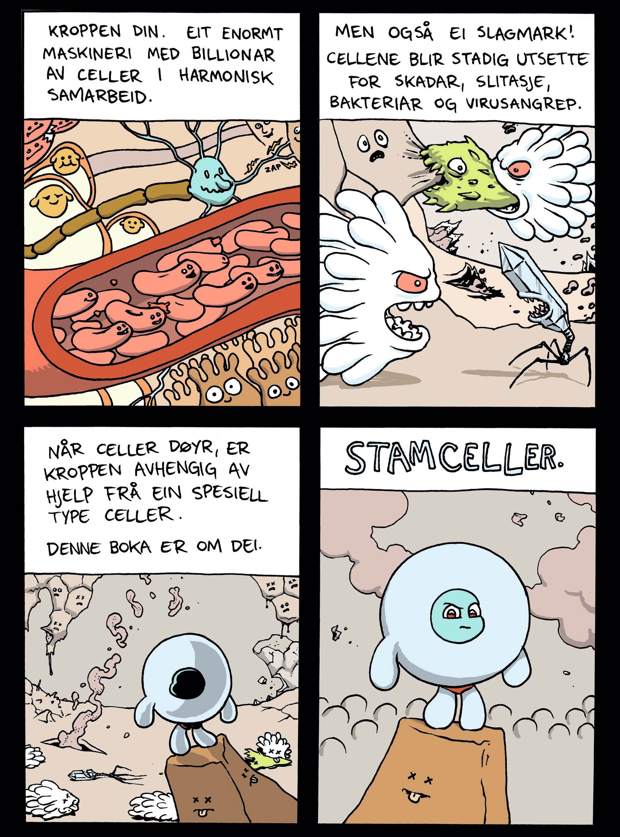 Dette er eit lysbildeshow med live-teikning og dokketeater, basert på faktaboka STAMCELLER. Teikneserieforfattar Øystein Runde snakkar om korleis stamceller kan brukast medisinsk til å reparera alvorlige skader, korleis DNA fungerer, og korleis ein norsk tannkirurg fekk til eit internasjonalt gjennombrudd med stamcellebehandling som kan reparerea skjelettet. Foredraget er laga for barn, men har ein tendens til å vere like bra for vaksne.