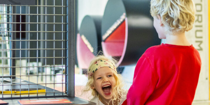 To barn ler mens de får støt i handa i hjerneutstillingen.